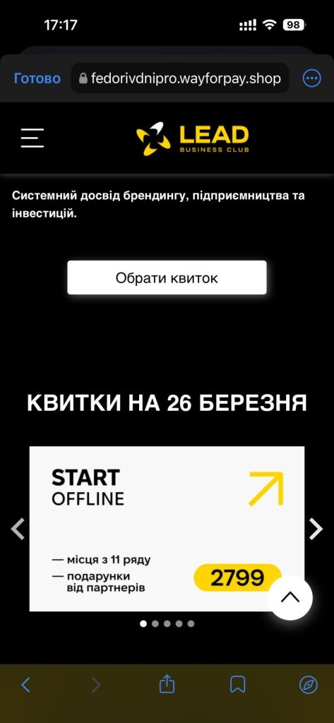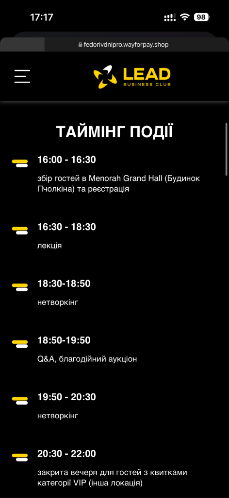 Перше, що має бути – це нормальна система покупки. Найпростіший варіант, який зараз використовують, аби не переплачувати сайтам з інтернет-квитками – сервіси на кшталт WayForPay або Fondy. Прямо на них можна зробити сторінку з описом події, програмою, FAQ і кнопкою оплати.