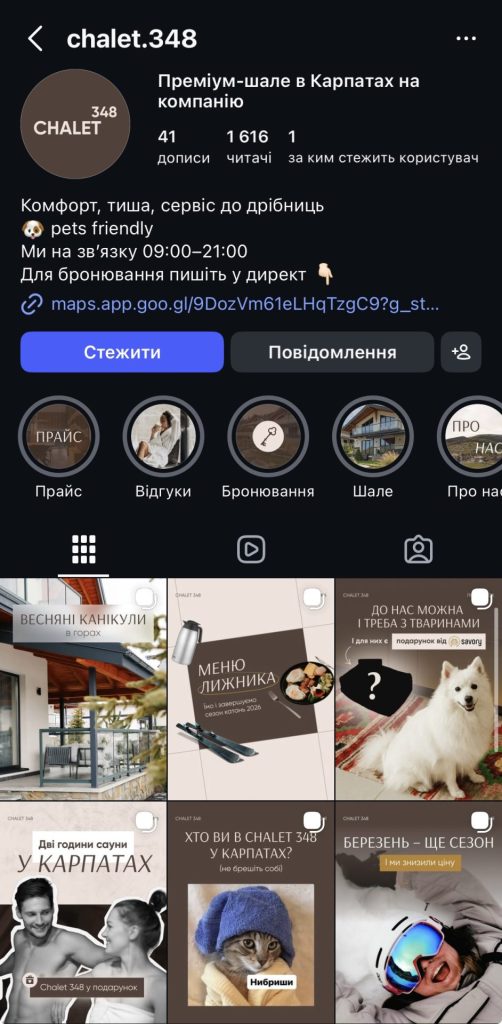 Так почалась співпраця, яка за два сезони – літній і зимовий – перетворила Інстаграм Chalet 348 на стабільний канал заявок, прямих звернень і бронювань.