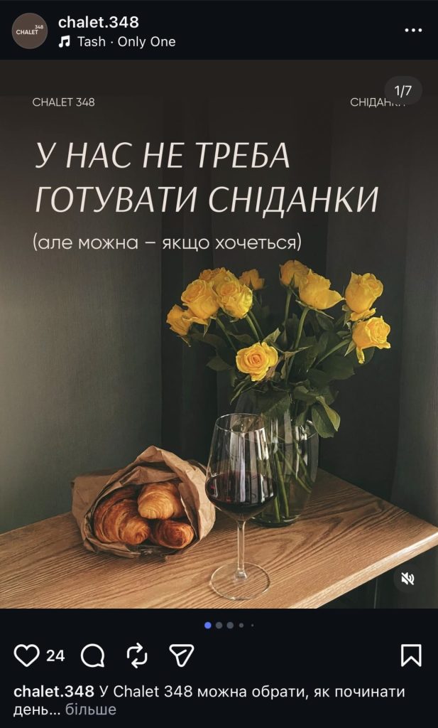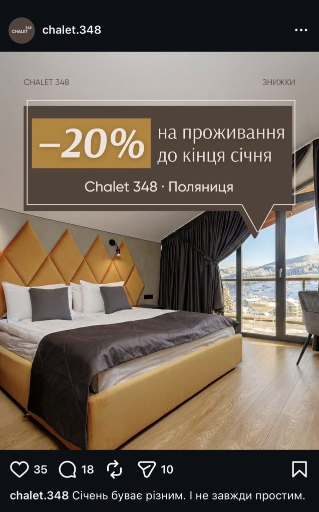 Instagram працює інакше. Він формує бажання, впізнаваність, повторні заїзди і лояльність. Він дозволяє створити базу гостей, які вже були, пам’ятають шале і можуть повернутися напряму.