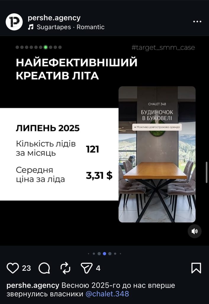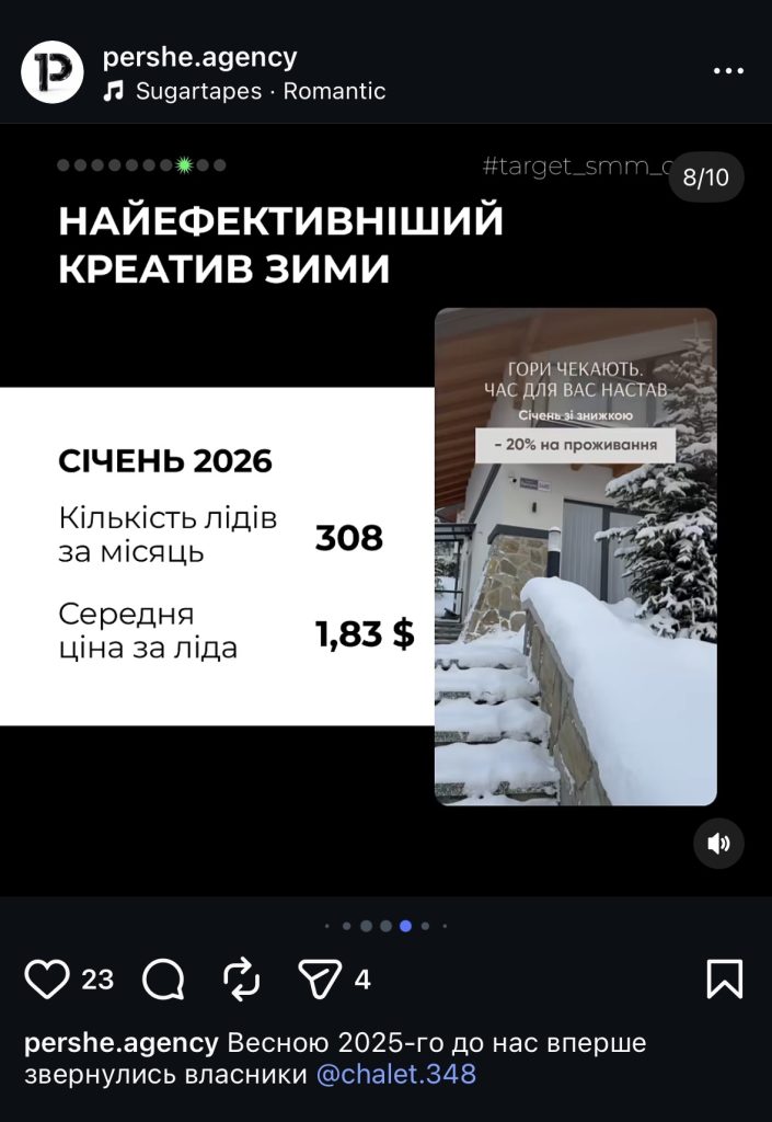 Ми почали зі створення акаунту, побудови візуальної логіки, сезонних акцентів і рекламних зв’язок, які не просто показували гарні фото шале, а відповідали на конкретне запитання гостя: чому їм варто їхати саме сюди.